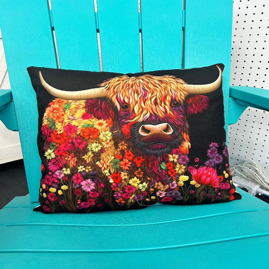 Display the beauty of nature in your home with the Justin Floral Cow Pillow. This decorative pillow features a highland cow grazing in a colorful flower field, adding a touch of tranquility to any room. Made with high-quality materials for long-lasting comfort and style.