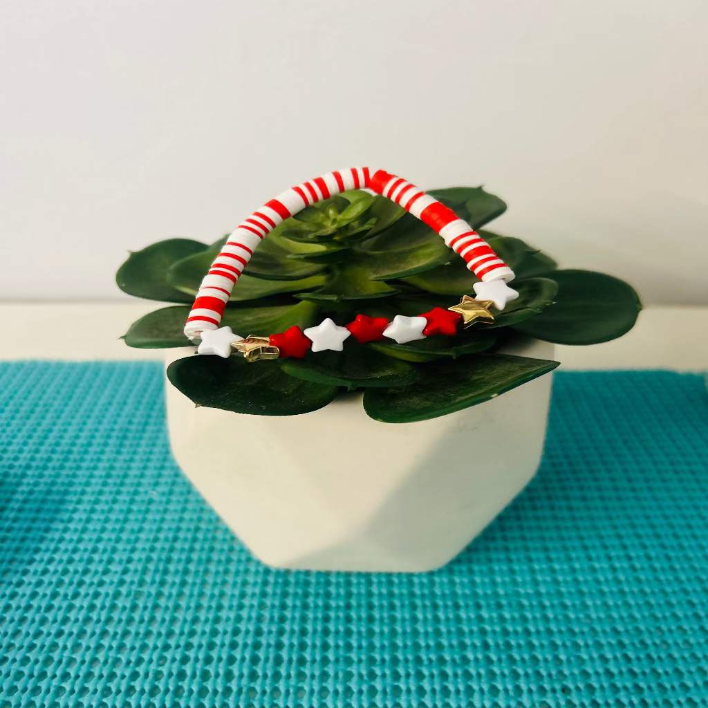 This red and white star bracelet features a stretchy design for a comfortable fit. The stretch also allows for versatile wear on any wrist size. Elevate your style with this trendy accessory.