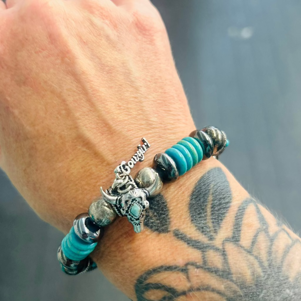 Elevate your style with the Whisky Moon Bracelet. Featuring a stunning bull skull pendant, accented with a cowgirl charm. This unique accessory adds a touch of Western charm to any outfit. Crafted with expert attention to detail, this bracelet is a must-have for any fashion-forward individual.